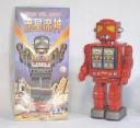 ■ブリキのおもちゃ GEAR ACE (ブリキ屋)□ ギアタイプロボットがバージョンアップ。両手を振り、両肩部のアンテナを動かしながら歩行します。胸部のギアが回り、頭部のカプセル部が光ります。メタリッ...
